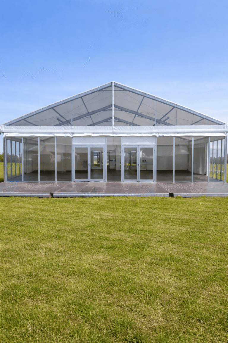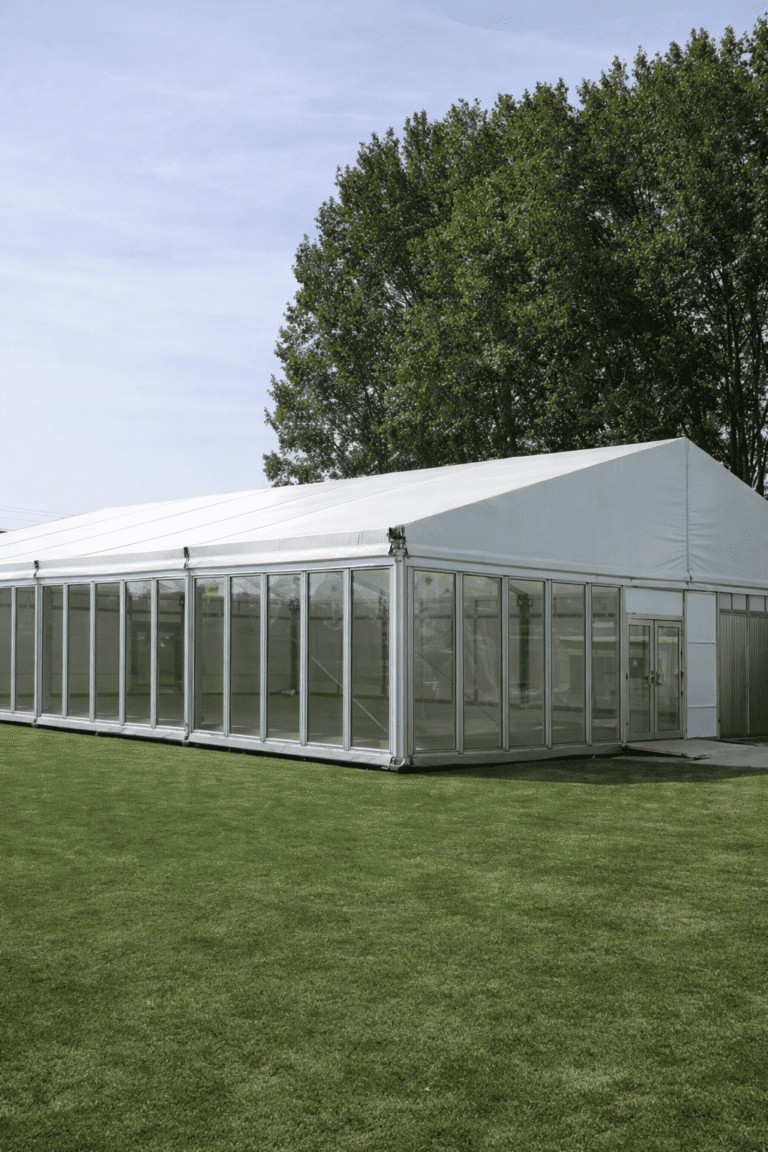 Le chapiteau 15m bipente est idéal pour créer un espace événementiel structuré : réception, inauguration, village exposants, zone traiteur ou espace technique.